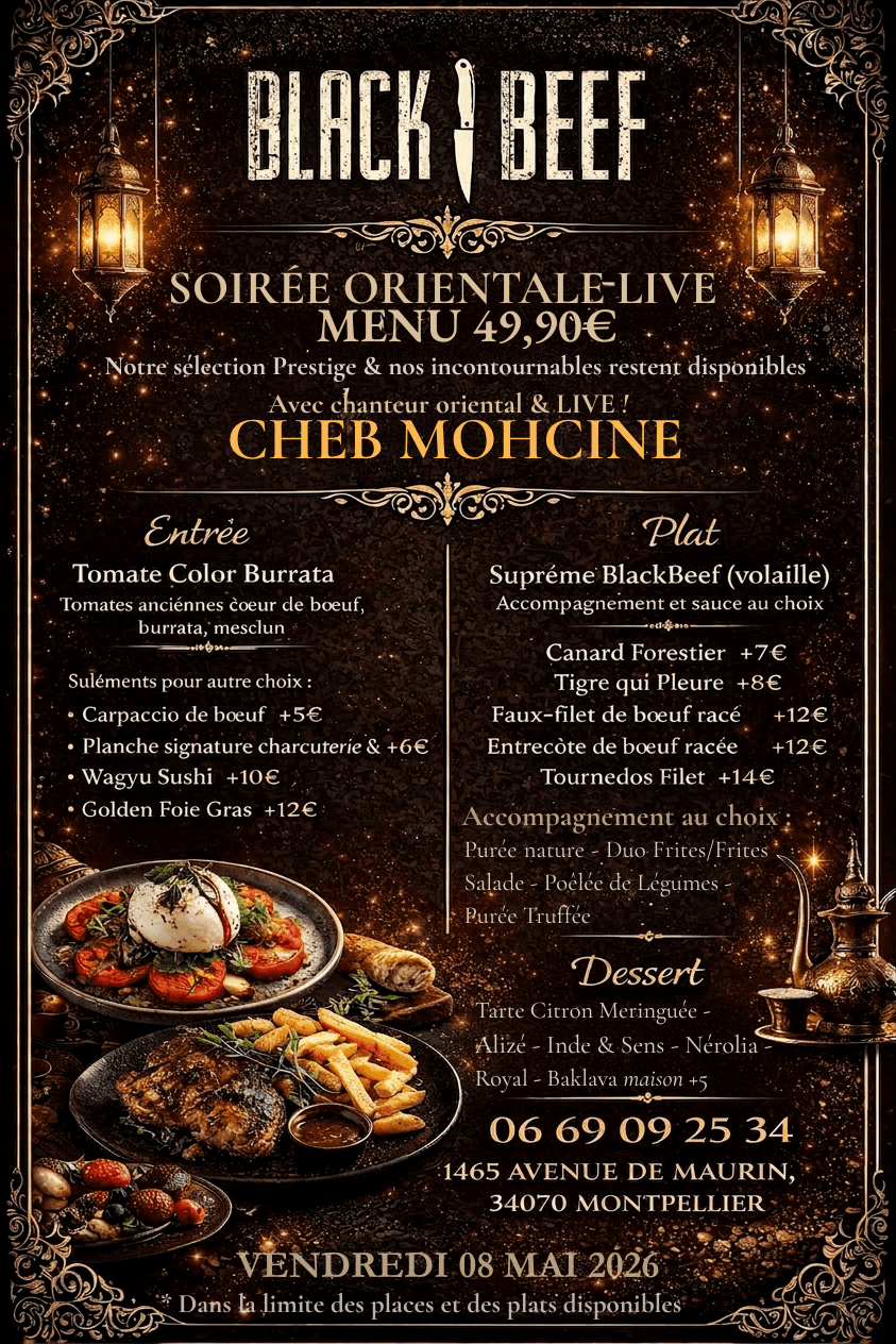 Le restaurant Halal BlackBeef est situé Avenue de Maurin, vous profiterez d’un accès facile jusqu’à notre établissement. Si vous comptez venir en voiture et que vous craignez de ne pas trouver un parking, rassurez-vous ! Nous avons un parking privé ainsi qu'un voiturier pour les clients de notre restaurant, vous garantissant ainsi toujours un endroit où se garer en sécurité votre voiture. Nous proposons aussi de réaliser votre soirée d'anniversaire dans notre restaurant.